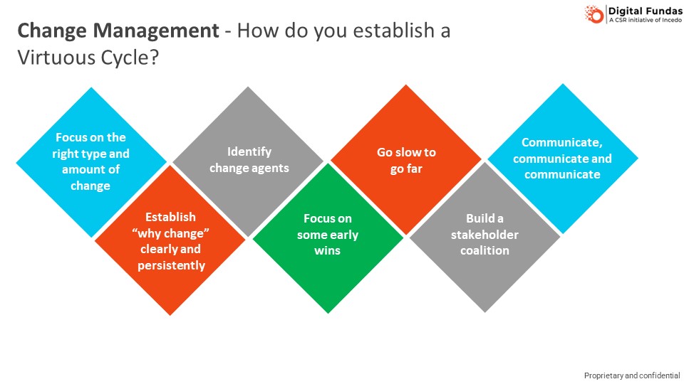 I have had the opportunity to be centrally involved in change management across multiple organizations. It started in McKinsey, where I had the opportunity to transform the McKinsey Knowledge Centre from a back-office research centre into a cutting-end innovation centre. My change management journey continued at Fidelity International, then Flipkart, and now at Incedo. While the industry focus and the change management objectives have been different across the organizations I have been involved in, there have been some common lessons.